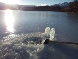 Boy Scout Lake is rough with air bubbles frozen mid pop in what appears to be a nice slush layer.